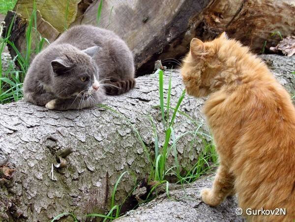 7. Замедление темпа движения. Сигнал, рассчитанный на большое расстояние, хорошо заметный. Кошки внимательно смотрят друг на друга, сближаются медленно, периодически отворачивая голову в сторону.