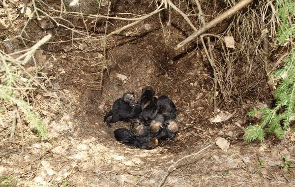 Родители постоянно переселяют своих щенков из одного логова в новое, особенно когда слишком много комаров или стоит дождливая погода. Как правило, новое логово, куда родители переводят детенышей, располагается достаточно близко к предыдущему — от 3 м до 1,3 км, хотя чаще в 10-30 м.