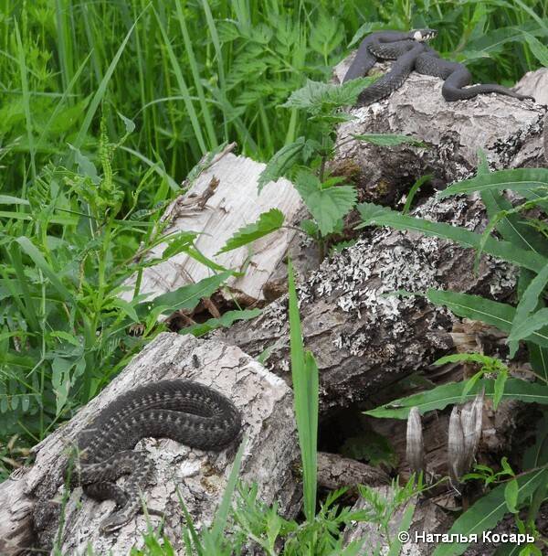 Существуют суждения, что гадюки и ужи избегают друг друга. По большей мере так оно и происходит, так как змеи территориальные животные, но их территориальность в первую очередь зависит от охраны кормового участка. По этой причине гадюки и ужи обычно избегают друг друга, как, впрочем и своих сородичей вне сезона спаривания, однако не всегда. Если кормовая база через-чур обильная, регистрируются случаи обитания обоих видов на определенных (обычно небольших) участках. Скорее всего они являются лишь небольшими смежными частями личных охотничьих участков. Однако публикаций в нашей литературе на эту тему найти не удалось. Автору сайта лично довелось обнаружить ужей и гадюку (одну, но очень крупную) на небольшом полигоне ТБО (примерно 100х100 м). Это легко объясняется обилием добычи для рептилий. Несколько обескураживает фото Н. Косарь, которое запечатлело баскинг гадюки и ужа в непосредственной близости. Впрочем, тут надо знать детали о кормовой базе этого места.