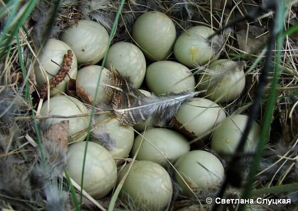 Количество яиц в кладке заметно увеличивается в направлении с севера на юг. Скорлупа гладкая, блестящая, однотонная - серовато-песочная, буровато-глинистая или охристо-оливковая. Вес яйца 14 г, длина 35 мм (32-45 мм), диаметр 27 мм (25-30 мм).
