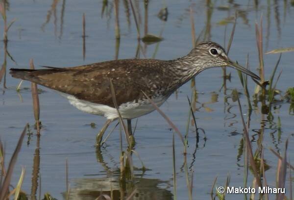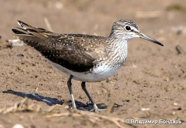 Взрослые птицы в брачном оперении сверху черновато-бурые с легким оливковым отливом на спине и крыльях. На темном фоне темени и зашейка хорошо выделяются светлые продольные полоски, верх тела покрыт мелкими беловатыми пятнышками. С темной спиной резко контрастируют белые поясница и надхвостье. Бока головы, шеи, передняя часть груди белые с многочисленными черновато-бурыми продольными пестринами. Подбородок, большая часть груди и остальной низ чисто-белые. Светлая бровь короткая, от клюва до глаза. Испод крыла темный. Маховые перья и их стержни черно-бурые. Подмышечные дымчатые с белыми поперечными полосками. Рулевые перья белые, две крайние пары с 1-2 черными пятнышками. Хвост с прямым обрезом. Ноги темные, зеленоватые или зеленовато-серые, недлинные. У летящей птицы ноги не выступают за край хвоста. Между основаниями среднего и наружного пальцев есть небольшая перепонка, между средним и внутренним пальцами такой перепонки нет. Клюв оливково-зеленый, к вершине чернеющий. Радужина темно-бурая.